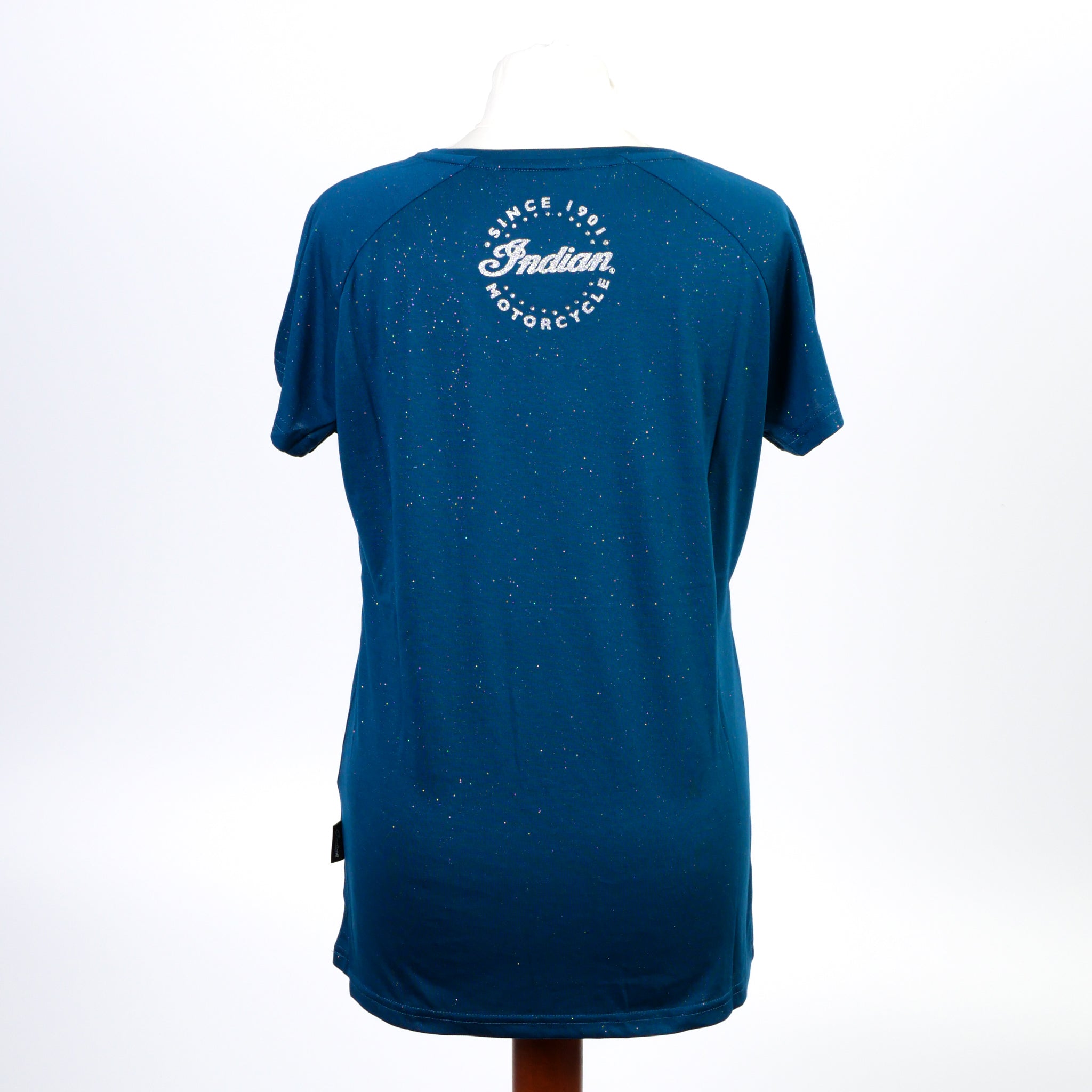 Oooooh spaaaaarkle!! This T-shirt uses a silver and teal sparkle color print for a subtle all over sparkle. The Indian Motorcycle logo is printed across the chest in silver glitter print. The photos really don't do it justice, to see it properly, select your size, click 'Add to cart' and proceed to Checkout!