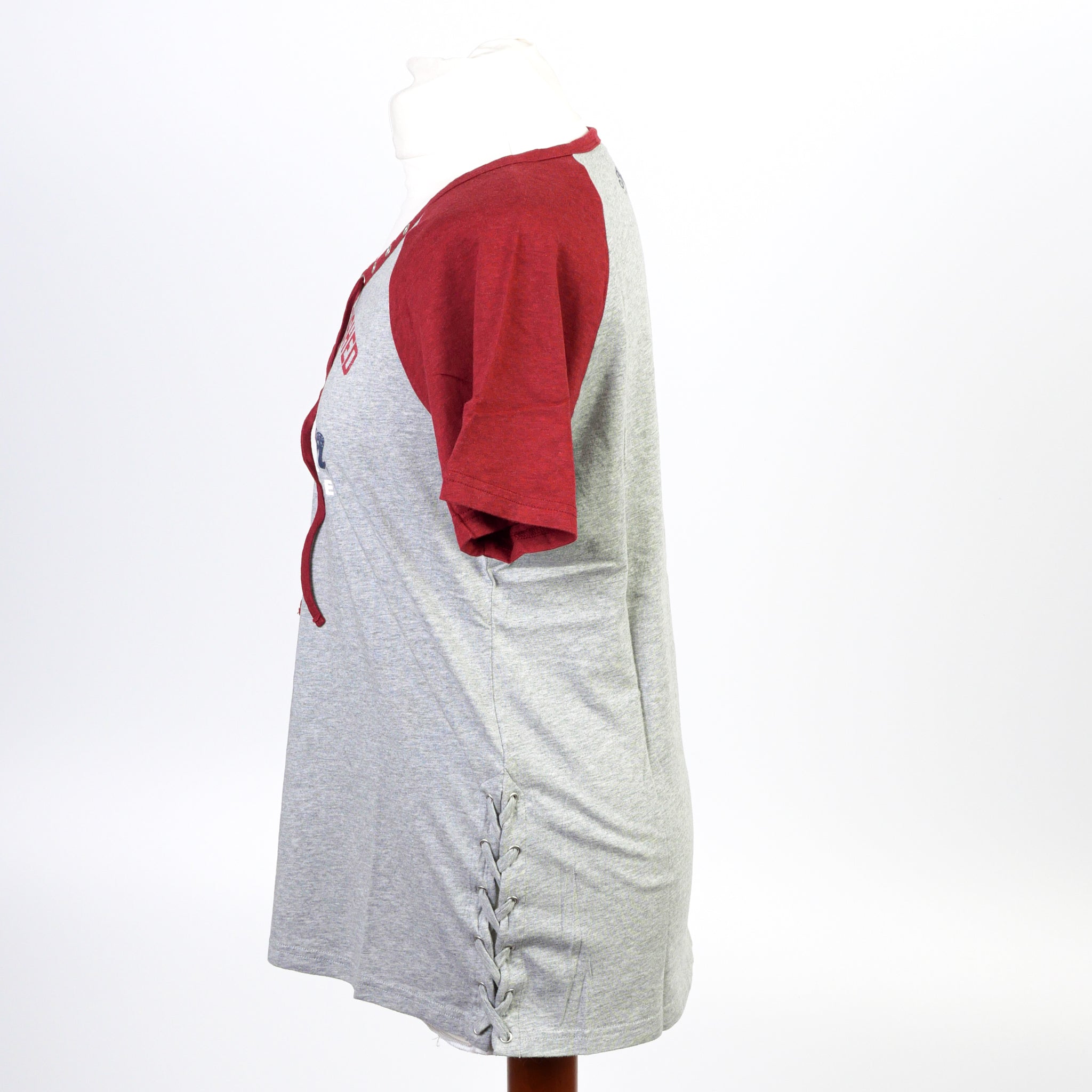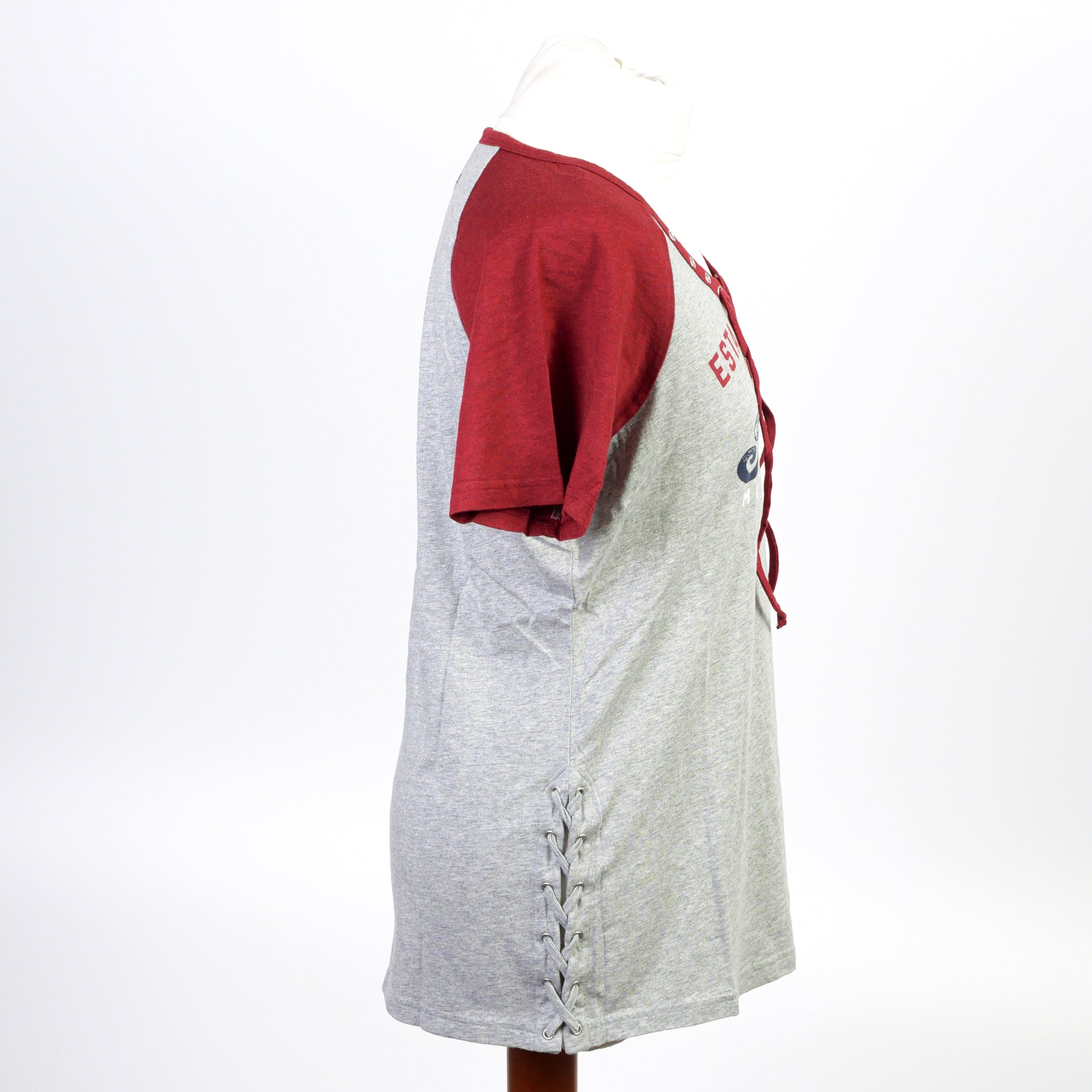 This T-shirt features a lattice lace-up neck and side ties. Relaxed Fit. Print on front.